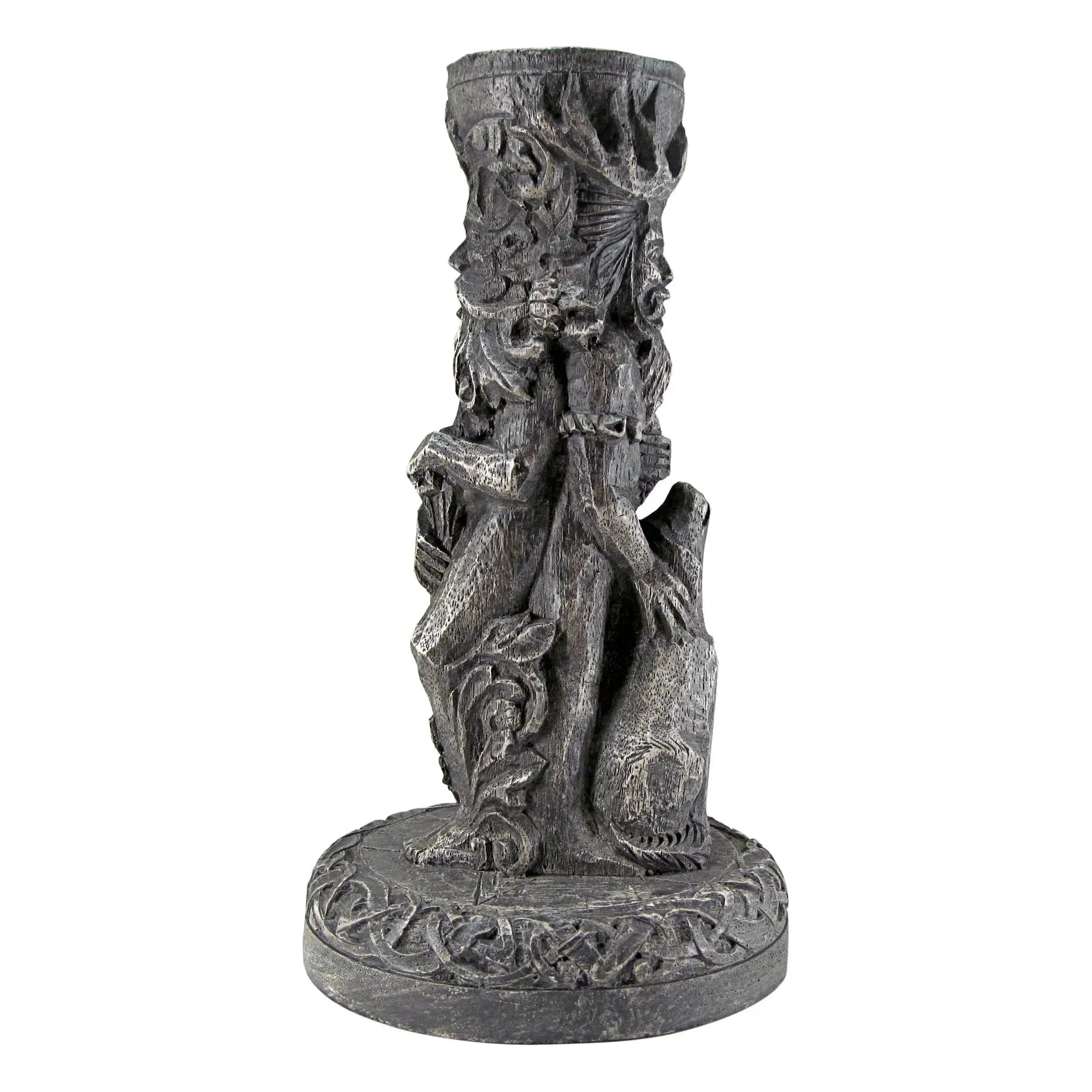 The two faces of the God stand back-to-back representing duality. The Leaf King, or Leaf Man, reigns Spring to Fall as the God of plenty and fruitful harvest. He is boisterous and loud, full of life, song, stories, and jokes. Carefree and thrilled to be alive, life arises wherever his staff touches. The Stag King, or Antlered God, along with his devoted hound, rules in the dark of the year and leads the wild hunt. His horns connect him with the animals who give sustenance in winter. The torc on his arm is a mystical symbol of authority. The Ram-headed serpent represents his seasonal office, possibly, Scorpio to Aries, his astrological reign.